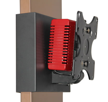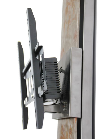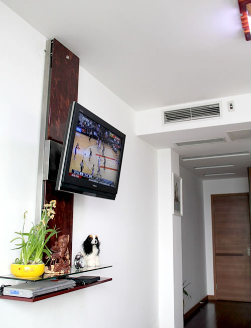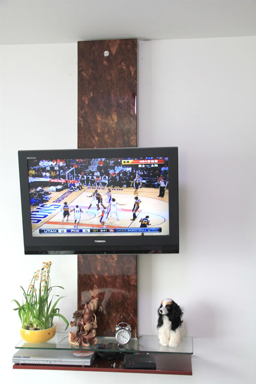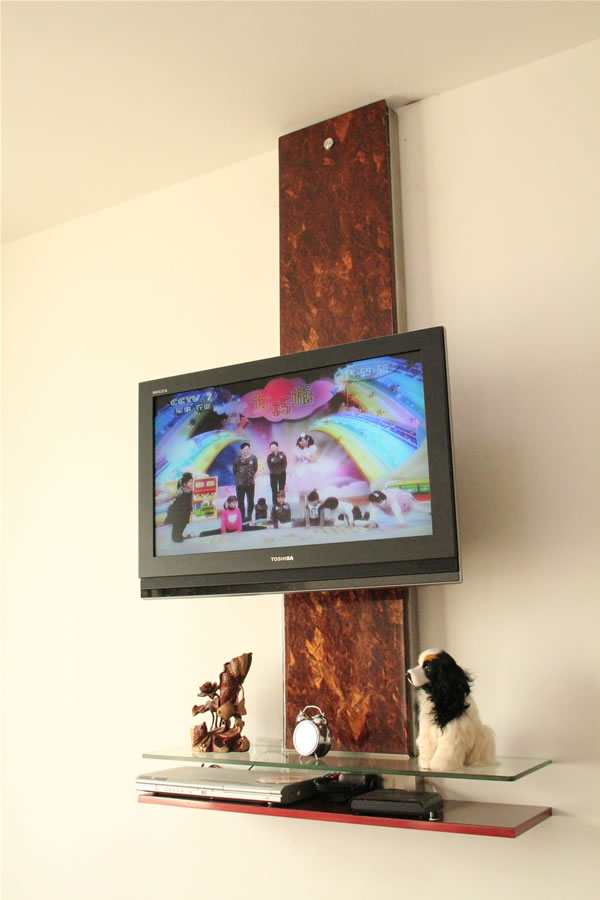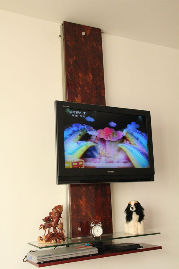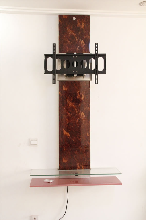 電動遙控電視機(jī)機(jī)架-導(dǎo)軌壁掛式從天花板到地面高度三分之二的墻面上安裝導(dǎo)軌,電視機(jī)架安裝在導(dǎo)軌上,電視機(jī)架在導(dǎo)軌上作垂直上下1100mm的自由升降,任意位置的停留;同時(shí),電視機(jī)機(jī)架可作前后18度的傾斜動作以及左右36度側(cè)向角度調(diào)節(jié)。在導(dǎo)軌下端安裝有精致小巧的嵌入式懸空臺面,材質(zhì)可為玻璃或樹脂板材,可放置DVD,碟片盒,機(jī)頂盒或花瓶等裝飾性小擺件,其優(yōu)點(diǎn)為節(jié)省地面空間,易于打掃。