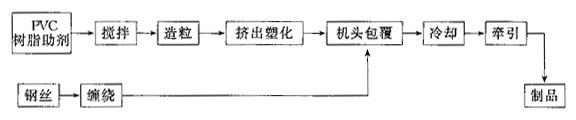 (一)主要用途 此種軟管具有抗正負壓力、耐酸堿、可彎曲等特點。主要用于農業(yè)、海洋漁業(yè)、輕工業(yè)氣體、液體輸送和河道淤泥清除等。 (二)工藝流程 pvc樹脂加入多種助劑用高速攪拌機攪拌均勻,使助劑充分吸收,并達到預塑化,再經(jīng)造粒機將粉狀樹脂制成粒狀備用。鋼絲經(jīng)彈簧纏繞裝置繞成彈簧,連續(xù)不斷地輸?shù)桨矙C頭內。粒狀樹脂通過擠出機加熱塑化在機頭內將彈簧包覆呈管狀,再經(jīng)冷水槽冷卻定型,牽引機拉出成為制品。 (三)主要設備
